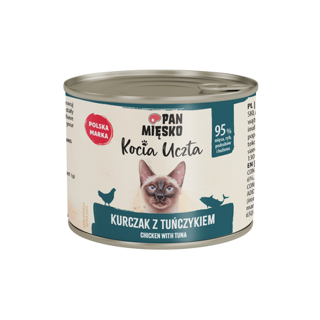 Pełnoporcjowa mokra karma Pan Mięsko Kocia Uczta – Kurczak z tuńczykiem, wzbogacona o inulinę, to połączenie uwielbianych przez koty smaków i składników, które wspierają zdrowe trawienie u Twojego kota.