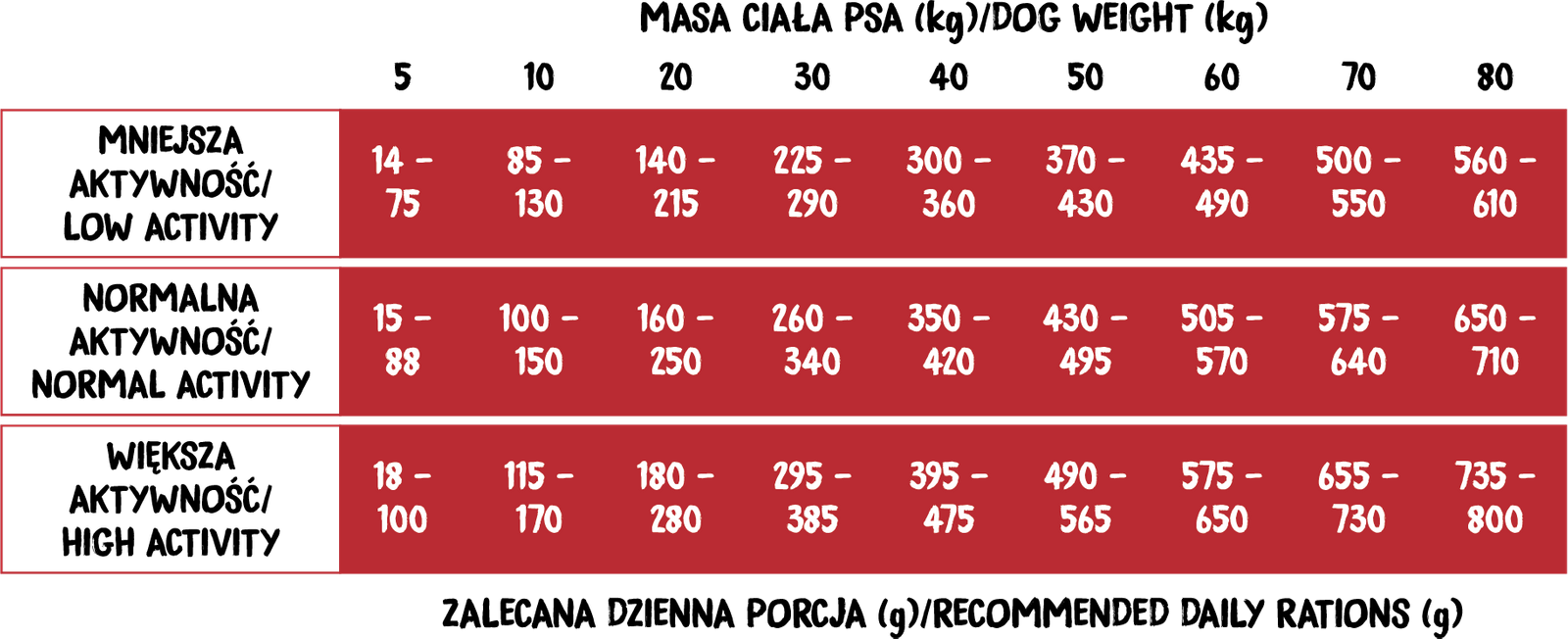 Podane w tabeli dzienne zapotrzebowanie jest orientacyjne. Każdy pies jest inny i ma różne potrzeby. Obserwuj swojego zwierzaka i zwiększ lub zmniejsz porcję dzienną karmy w razie potrzeby. Pamiętaj, aby zapewnić mu stały dostęp do świeżej wody! Przechowuj karmę w chłodnym i suchym miejscu. Pamiętaj o dokładnym zamknięciu opakowania po każdym karmieniu.