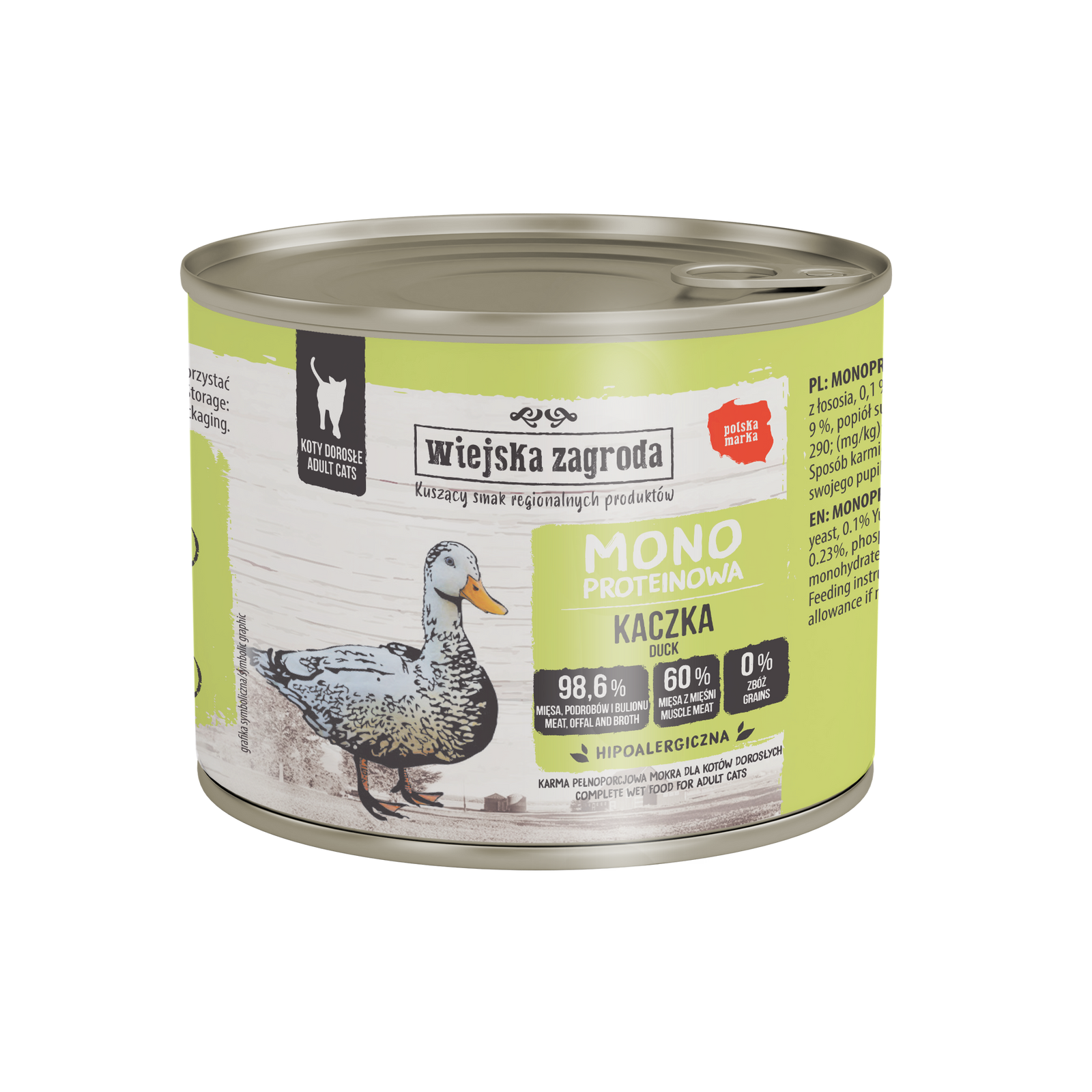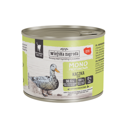 SKŁAD: 70 % kaczka (60 % mięso, 10 % wątroba), 28,6 % bulion z kaczki, 1 % składniki mineralne, 0,2 % olej z łososia, 0,1 % drożdże piwne suszone, 0,1 % ekstrakt Yucca Mojave.
