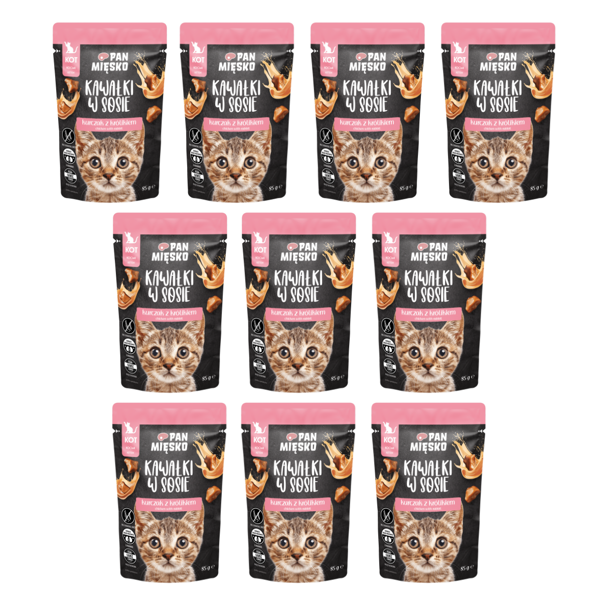 Karma mokra Pan Mięsko Kawałki w sosie Kurczak z królikiem została opracowana z myślą o kociętach wszystkich ras, w wieku od 3. tygodnia do 12. miesiąca życia. Sprawdzi się zarówno jako główna karma, jak i uzupełnienie diety w okresie intensywnego wzrostu.