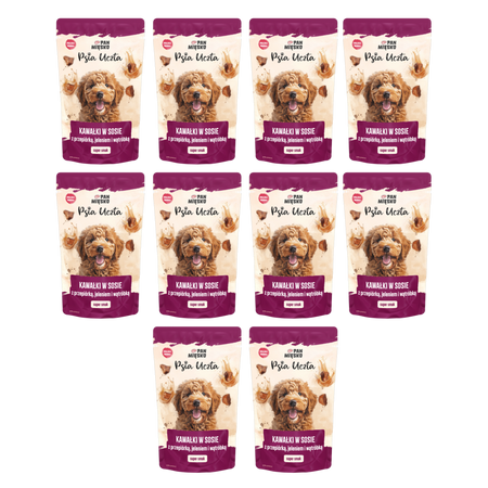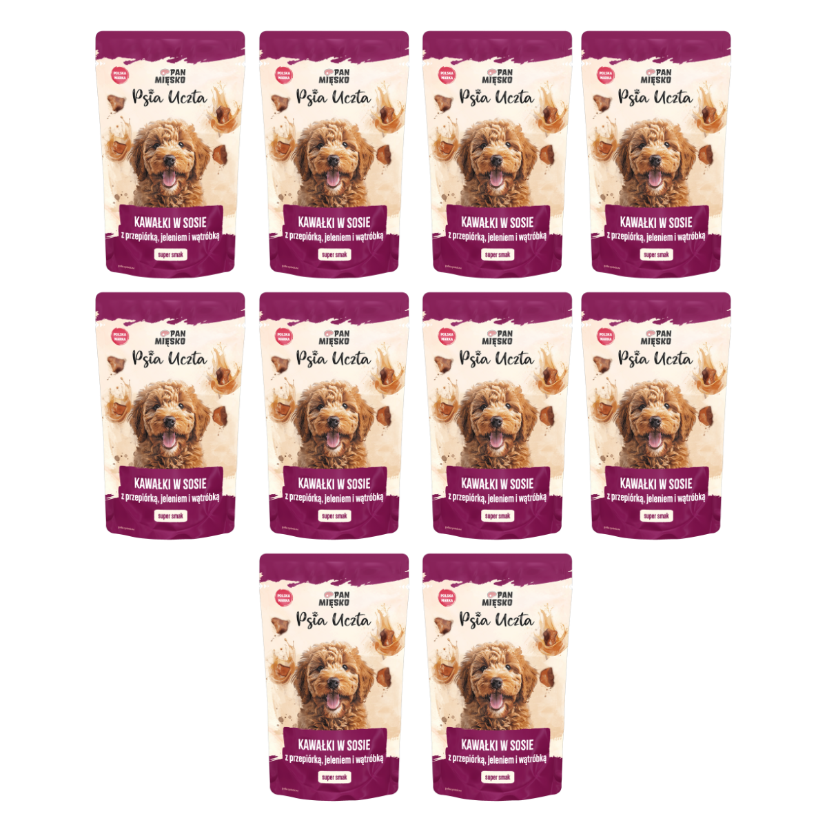 Zestaw Karma mokra dla psa Pan Mięsko Psia Uczta Kawałki w sosie z przepiórką, jeleniem i wątróbką (dorosły) 150g x 10 szt.