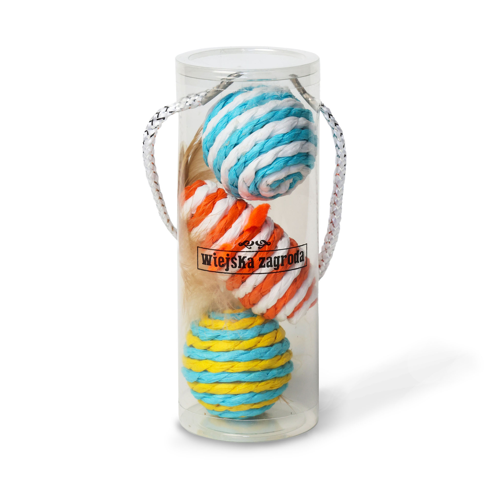 ZAWARTOŚĆ ZESTAWU: Dwie kolorowe piłeczki oraz jedna zabawka z piórkami – wszystko w poręcznym, przezroczystym opakowaniu z logo Wiejska Zagroda.